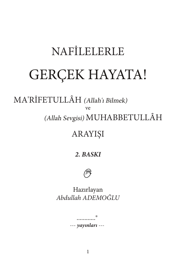 "Dünya hayatının geçici telaşları arasında kaybolan kalbimiz, asıl sahibini arıyor. İnsanın yaratılış gayesi; Yaratıcısını tanımak ve O’nu sevmektir. Abdullah Ademoğlu'nun kaleme aldığı bu eser, nafile ibadetlerin nuruyla aydınlanan bir yolda, sizi 'Gerçek Hayat'a davet ediyor. Sadece bilmek değil, sevmek ve hissetmek isteyenler için; Marifetullah kapısından girip Muhabbetullah ikliminde nefes alacağınız eşsiz bir rehber.